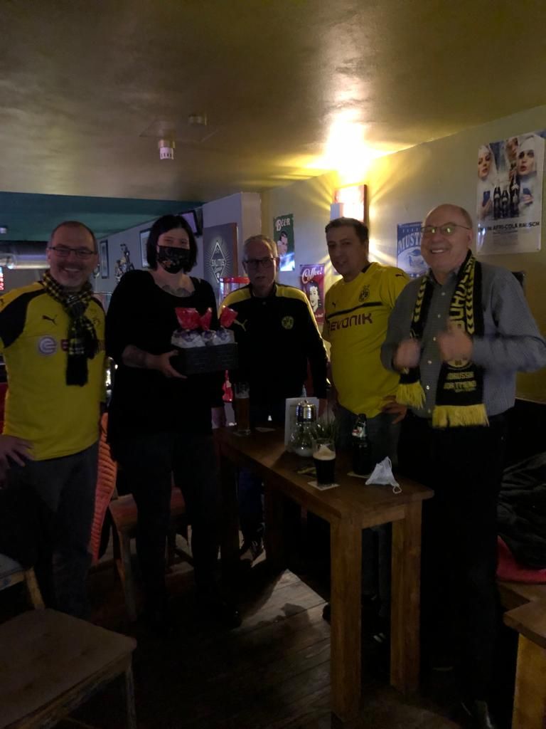 Der BVB-Fanclub Warendorf e.V. bedankt sich bei Jutta und Ihrem Team für die hervorragende Bewirtung in der „Alten Frieda„ im Jahr 2021. Beim letzten Hinrundenspiel gegen Hertha BSC Berlin, welches mit 2:3 verloren ging, überreichten Mitglieder des Fanclubs Warendorf e.V. als kleines Dankeschön etwas süßes für die kommenden Weihnachtstage.