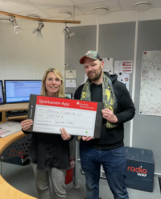 Am 19.12.2023, dem Geburtstag des BVB 09 aus Dortmund, übergab der BVB- Fanclub Warendorf e.V. ,in Vertretung durch Tim Paschel, den symbolischen Scheck über 319,09€ für die Aktion Lichtblicke e.V.. Die Übergabe konnte der ganze Kreis Warendorf im Radio WAF mitverfolgen. Das Geld ist für die freie Verwendung in unserer Region gedacht, sodass wir den Menschen, welche in Not geraten sind, hoffentlich etwas helfen können. Als kleinen Mutmacher ,für die Menschen dort draußen, denen es momentan nicht so gut geht, hatte Tim den passenden Song gefunden. Denkt immer alle daran........